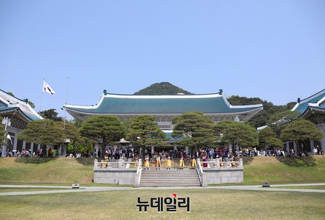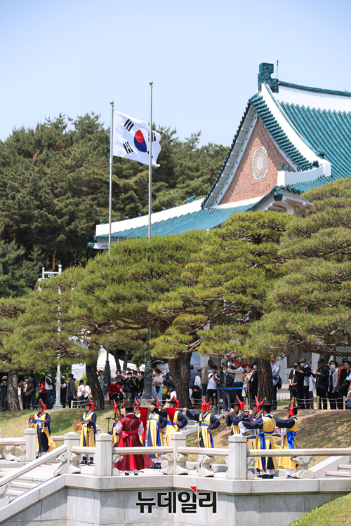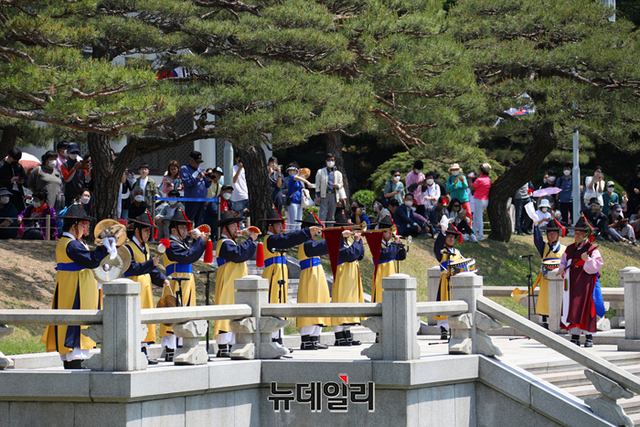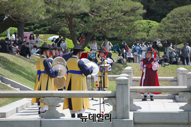 국립국악원이 청와대가 개방된 11일부터 청와대 대정원에서 국립국악원 정악단의 대취타 연주를 선보이고 있다. 국립국악원 공연은 매일 오전 11시 30분부터 12시까지 30분간 진행된다. (사진=국립국악원)