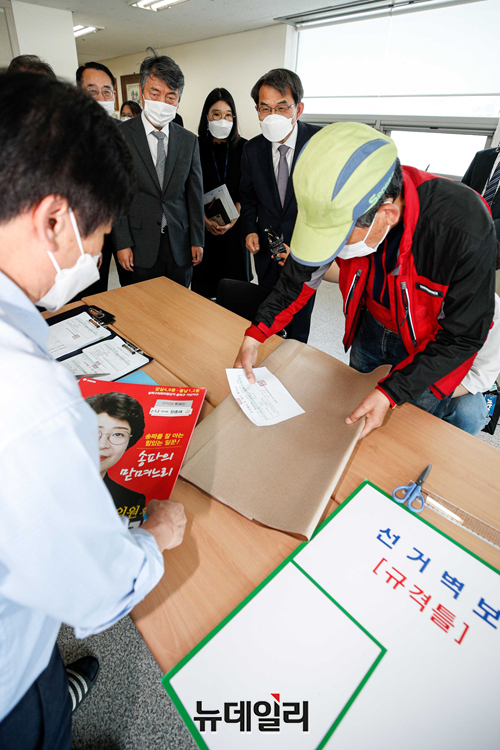 노태악 중앙선거관리위원회 위원장이 17일 오후 서울 송파구 선거관리위원회를 방문해 우편투표함 보관장소를 점검하고 있다.