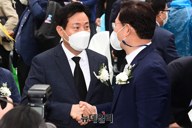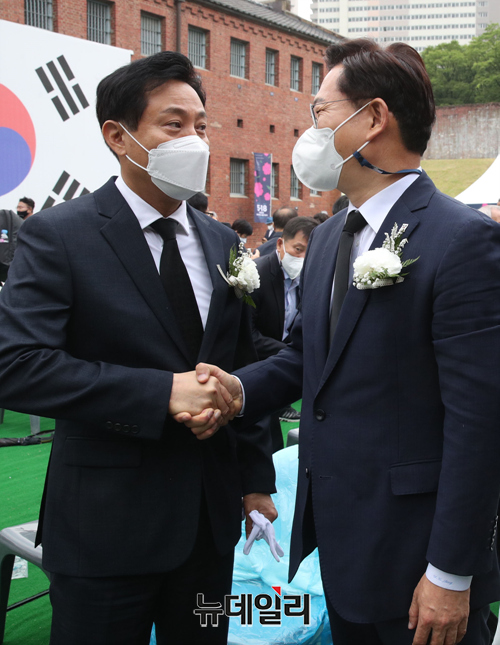 오세훈 국민의힘 서울시장 후보와 송영길 더불어민주당 서울시장 후보가 18일 오전 서울 서대문구 서대문형무소 역사관에서 열린 5.18 민주화운동 기념식에서 악수를 하고 있다.
