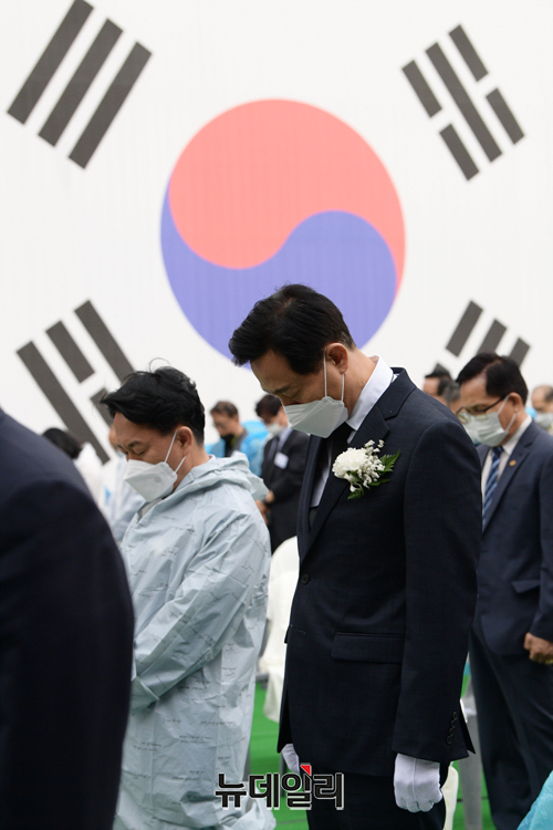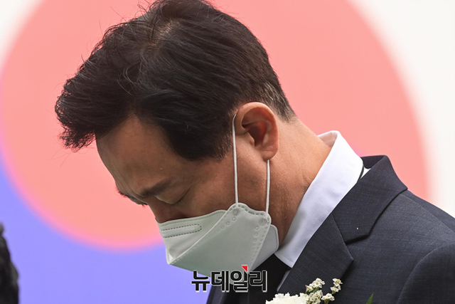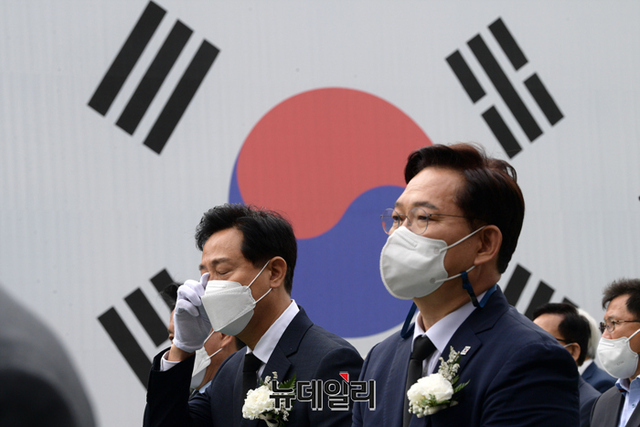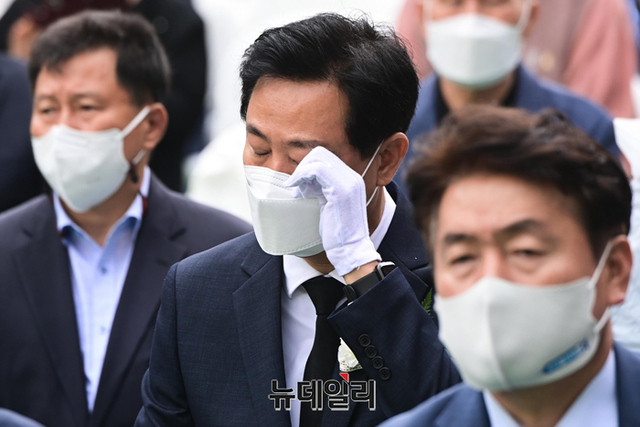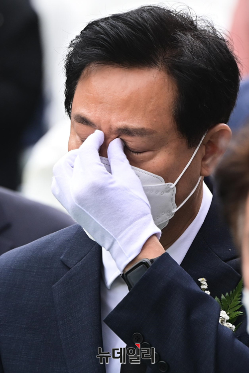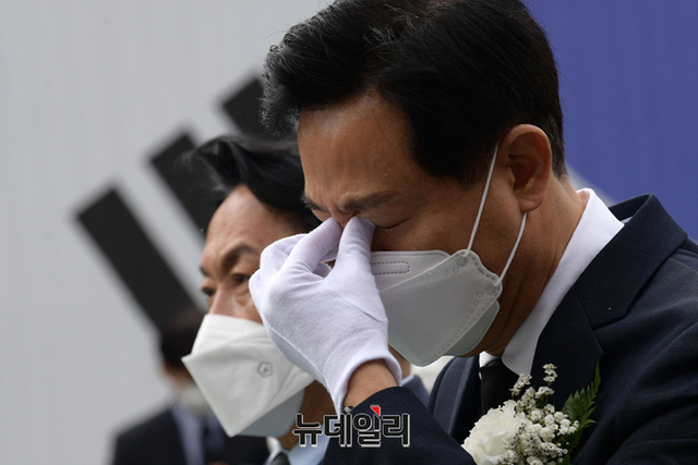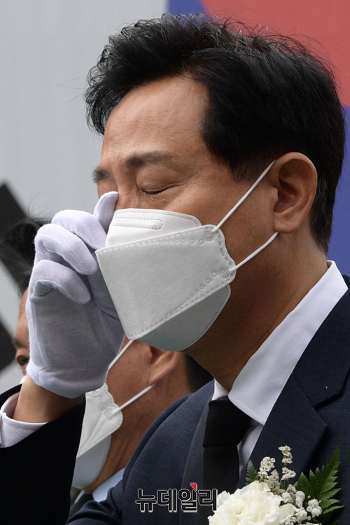 오세훈 국민의힘 서울시장 후보가 18일 오전 서울 서대문구 서대문형무소 역사관에서 열린 5.18 민주화운동 기념식에서 눈물을 훔치고 있다.