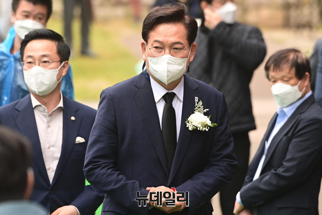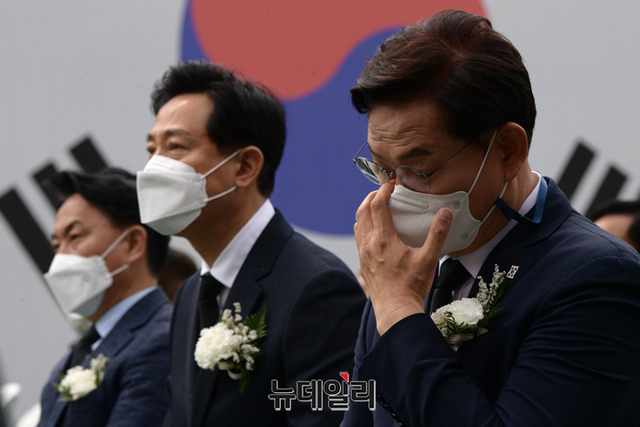 송영길 더불어민주당 서울시장 후보가 18일 오전 서울 서대문구 서대문형무소 역사관에서 열린 5.18 민주화운동 기념식에 이동하고 있다.