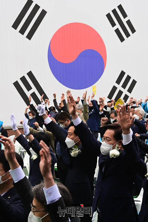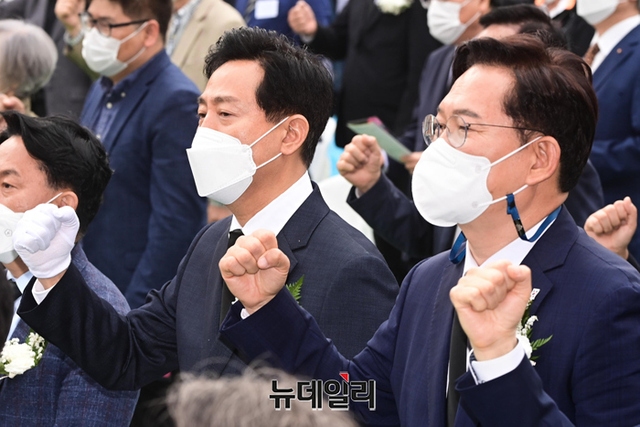 오세훈 국민의힘 서울시장 후보와 송영길 더불어민주당 후보를 비롯한 참석자들이 18일 오전 서울 서대문구 서대문형무소 역사관에서 열린 5.18 민주화운동 기념식에서 만세삼창을 하고 있다.
