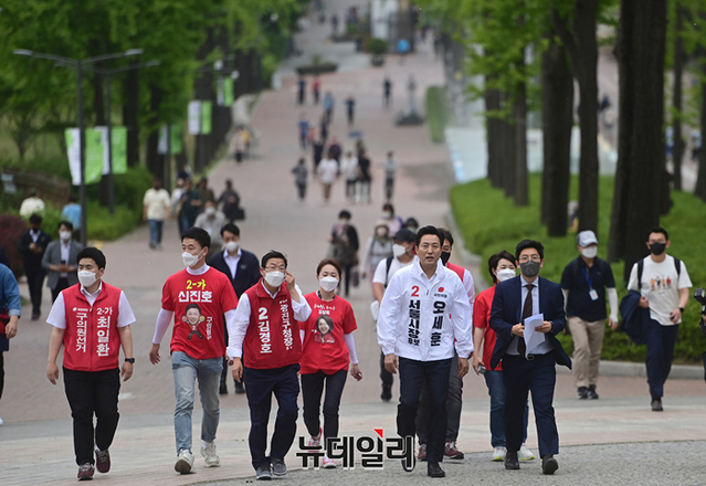 오세훈 국민의힘 서울시장 후보가 18일 오후 서울 광진구 서울어린이대공원을 방문해 어린이와 인사를 나누고 있다.