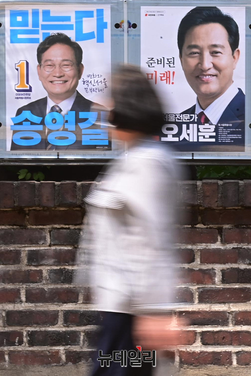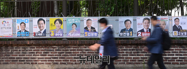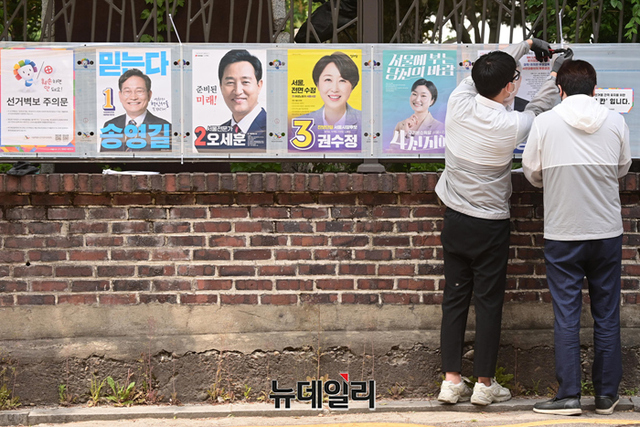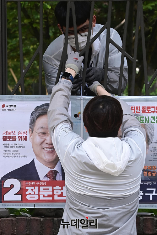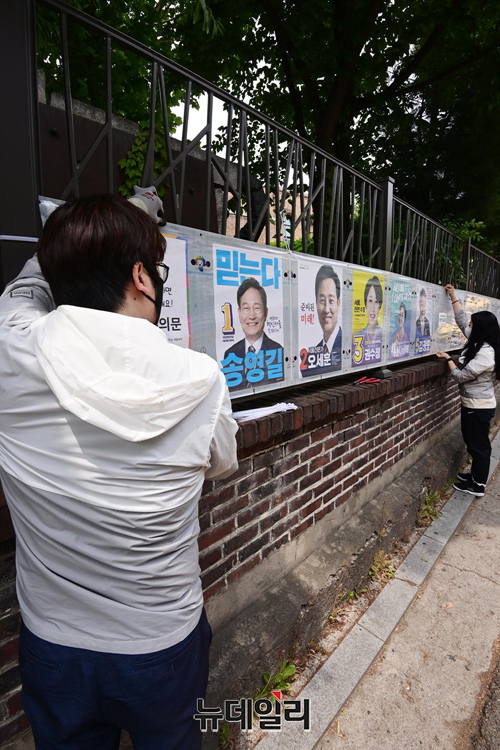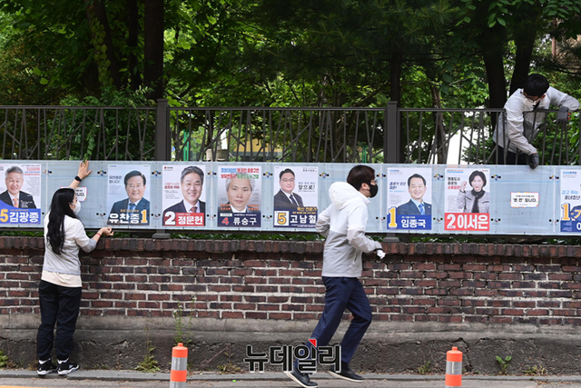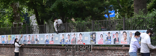 제8회 전국동시지방선거 공식 선거운동이 시작된 19일 오후 서울 종로구 예술가의 집 인근에서 선거관리위원회 직원들이 선거벽보를 첩부하고 있다.공식 선거운동 기간은 19일부터 31일까지다. 사전투표는 27, 28일 실시된다. 본투표는 6월 1일이다.선거 당일에는 지자체장과 지방의회 의원, 교육감 등을 선출하는 지방선거와 국회의원보궐선거가 동시에 실시된다.코로나19 격리자는 사전투표 마지막 날인 28일 오후 6시 30분부터 8시까지 투표 가능하다. 선거당일은 오후 6시 30분부터 7시 30분까지 투표를 할 수 있다.