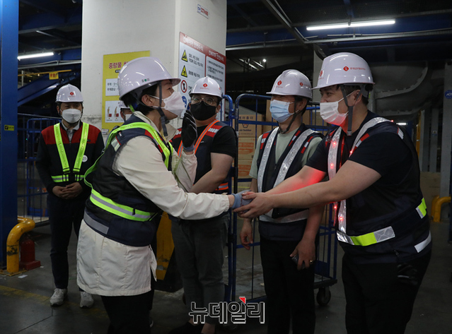 김은혜 국민의힘 경기지사 후보가 공식 선거운동이 시작된 19일 자정 경기 군포HUB 터미널 방문해 택배분류 작업을 하고 있다. (사진=김은혜 캠프)