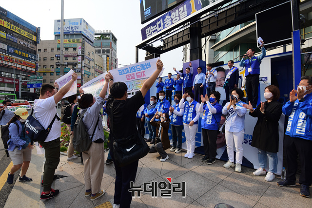 차별금지법제정연대 회원들이 19일 오후 서울 노원구 노원역 인근에서 열린 송영길 더불어민주당 서울시장 후보 집중유세에서 차별금지법 제정을 촉구하는 피켓을 들고 법제정을 요구하고 있다.