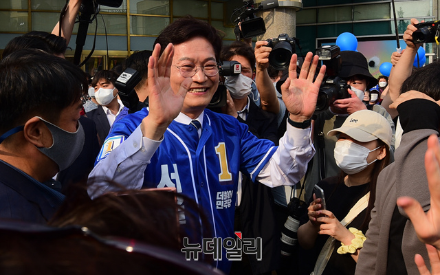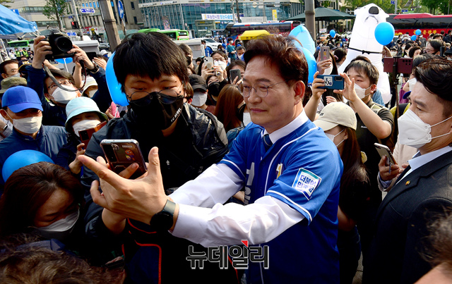 송영길 더불어민주당 서울시장 후보가 19일 오후 서울 노원구 노원역 인근에서 열린 집중유세를 마치고 시민들과 인사를 나누고 있다.