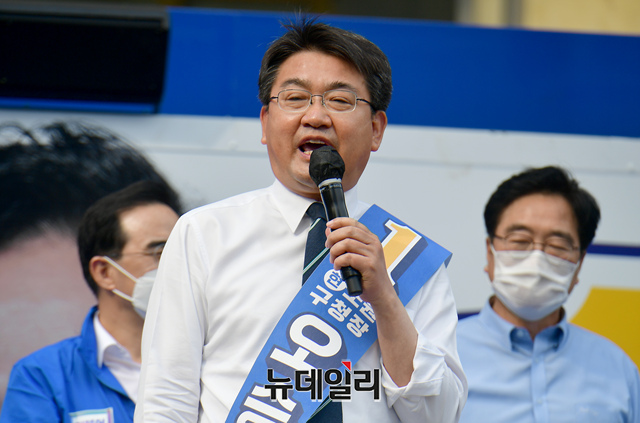 오승록 더불어민주당 노원구청장 후보가 19일 오후 서울 노원구 노원역 인근에서 열린 집중유세에서 지지를 호소 하고 있다.