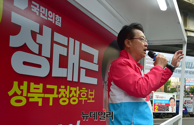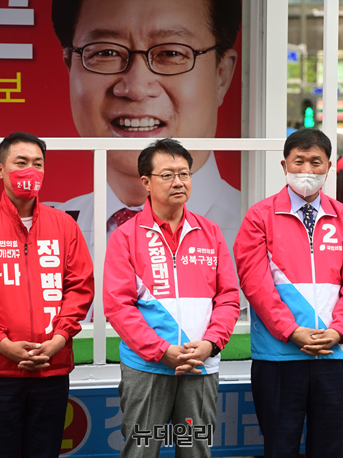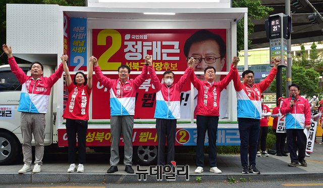 정태근 국민의힘 성북구청장 후보와 시의원·구의원 후보들이 19일 오후 서울 길음역 인근에서 출정식을 갖고 시민들에게 인사를 하고 있다.