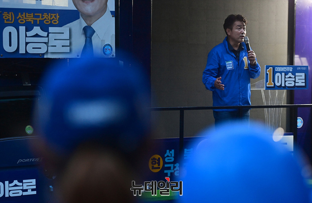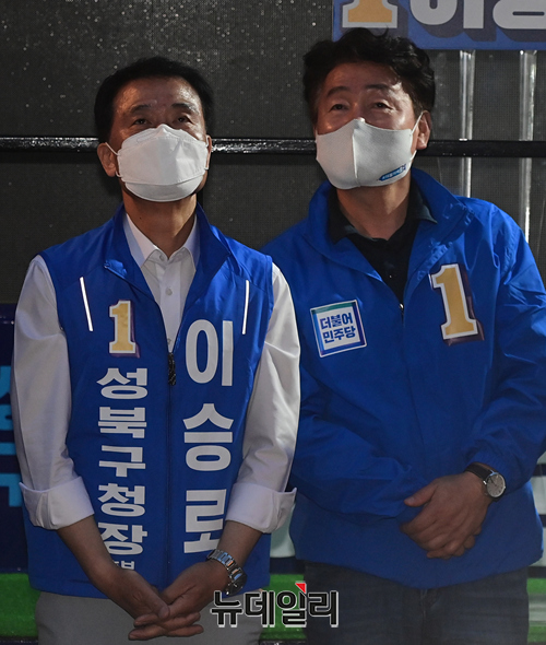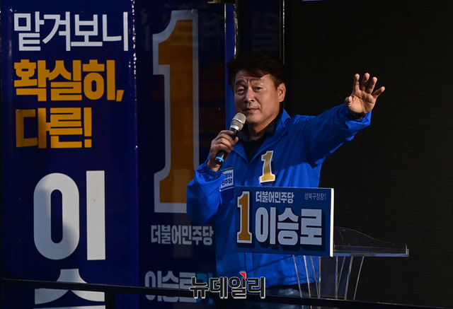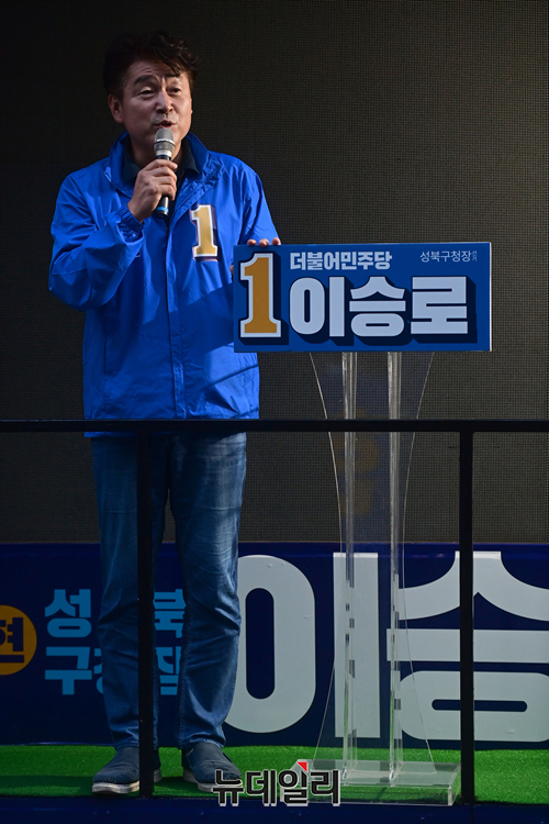 기동민 더불어민주당 의원이 19일 오후 서울 길음역 인근에서 열린 이승로 성북구청장 출정식에서 지원유세를 하고 있다.