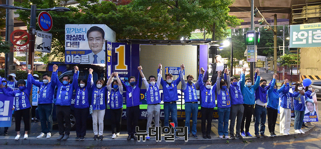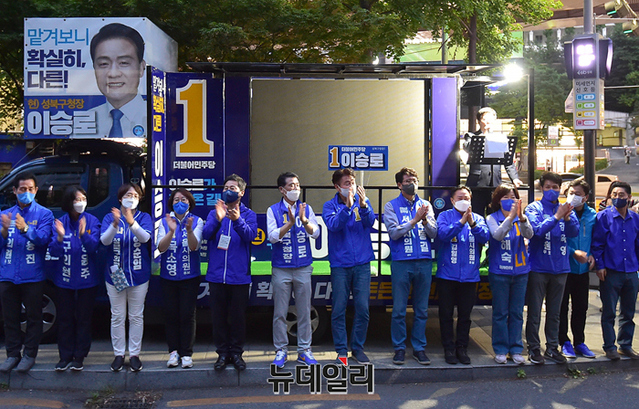 이승로 더불어민주당 성북구청장 후보가 19일 오후 서울 길음역 인근에서 열린 출정식에서 어린이로 부터 꽃다발을 받고 있다.