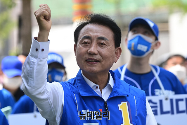 윤환 더불어민주당 계양구청장 후보가 20일 오후 인천 계양구 계양3동에 위치한 한 식당에서 지지호소를 하고 있다. (인천=강민석 기자)