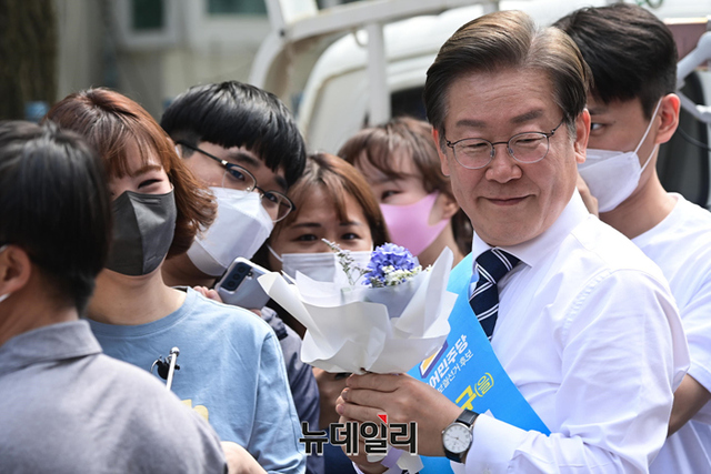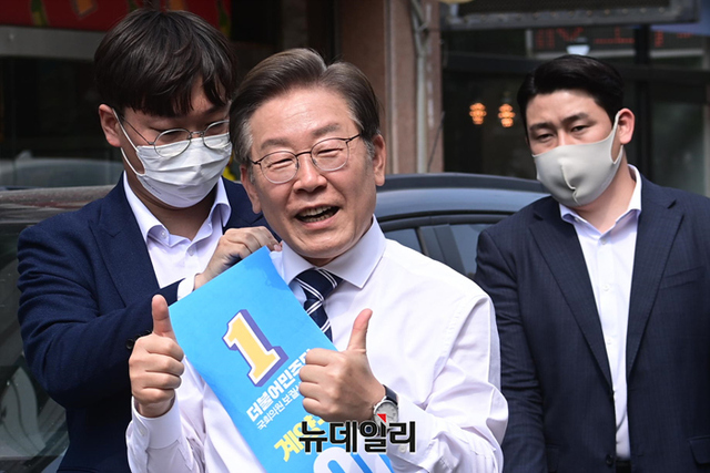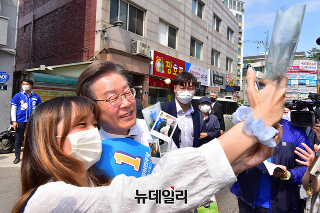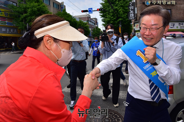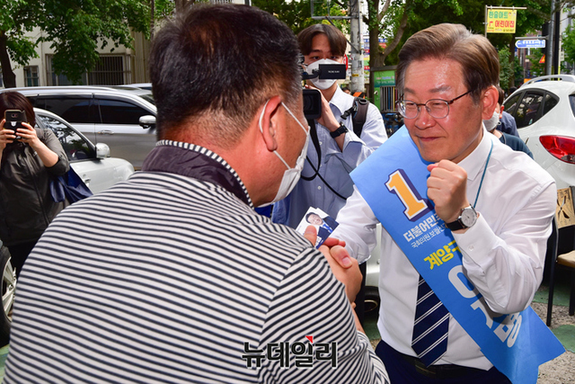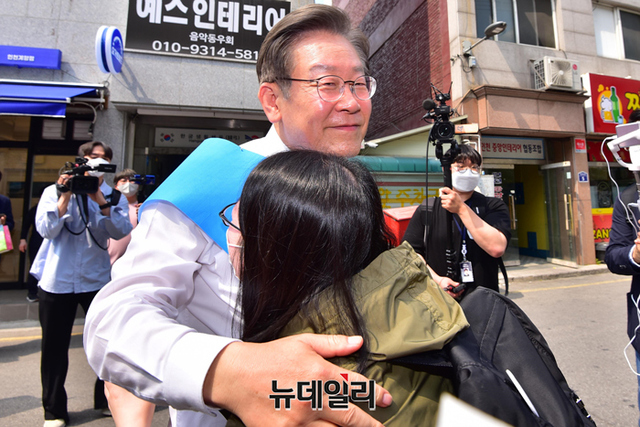 이재명 더불어민주당 인천 계양을 국회의원 후보가 20일 오후 인천 계양구 계산3동을 찾아 시민과 포옹을 하고 있다. (인천=강민석 기자)