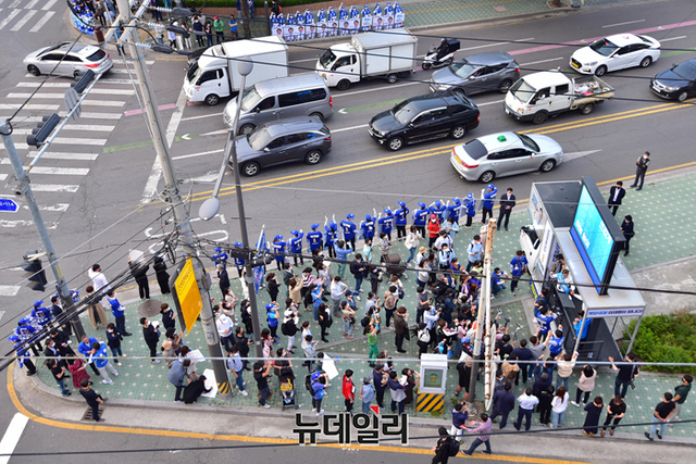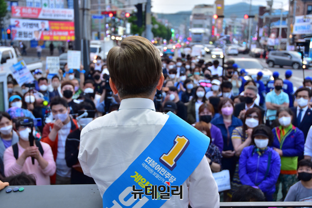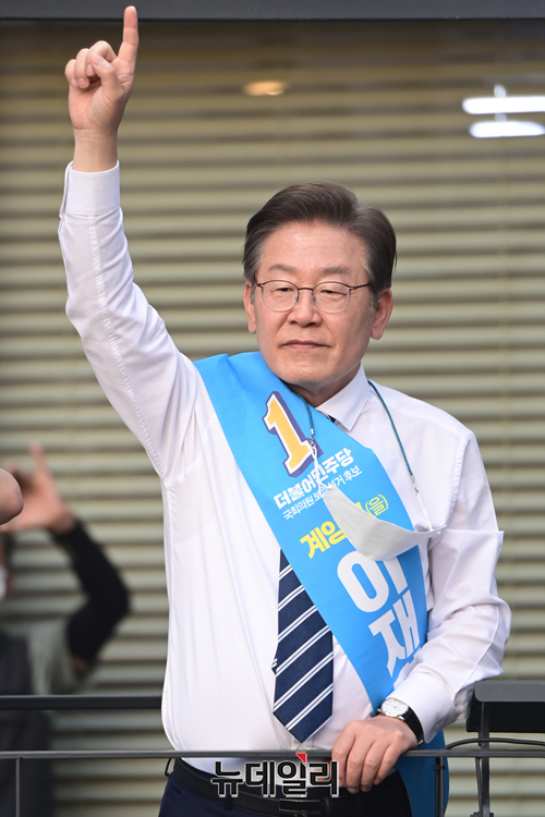 이재명 더불어민주당 인천 계양을 국회의원 후보가 20일 오후 인천 계양구 계산로 인근에서 지지호소를 하고 있다. (인천=강민석 기자)