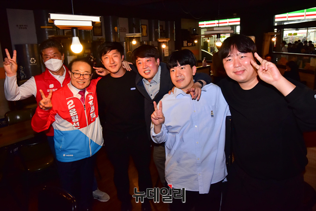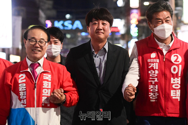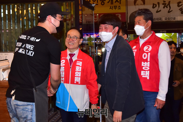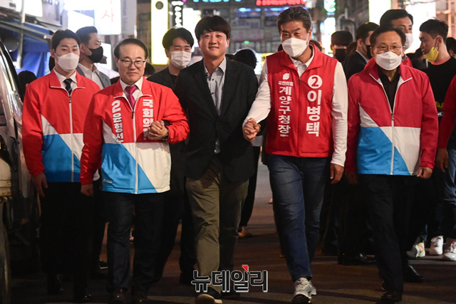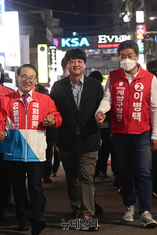 이준석 국민의힘 대표(가운데), 윤형선 인천 계양구을 국회의원 후보, 이병택 계양구청장 후보가 20일 오후 인천 계양구 임학동 먹자골목에서 손을 잡고 이동하고 있다. (인천=강민석 기자)