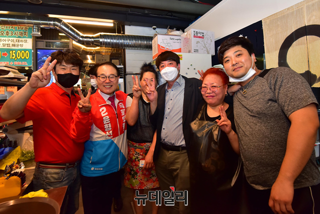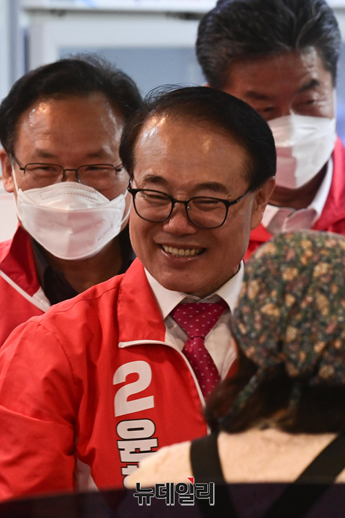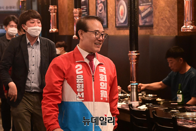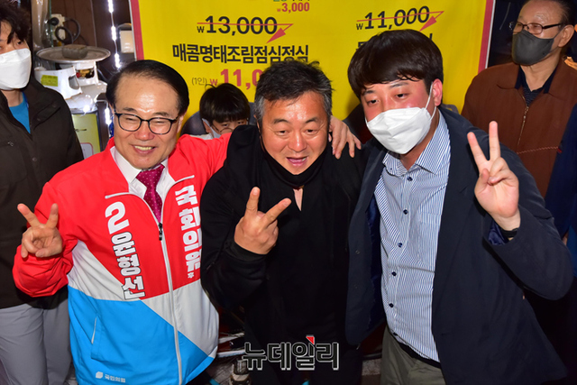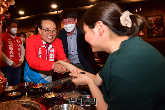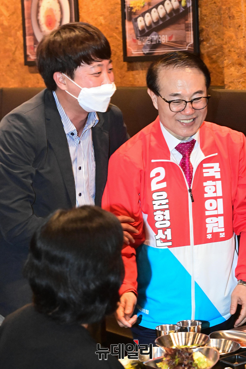 윤형선 국민의힘 인천 계양구을 국회의원 후보가 20일 오후 인천 계양구 임학동 먹자골목에서 시민과 악수를 나누고 있다. (인천=강민석 기자)