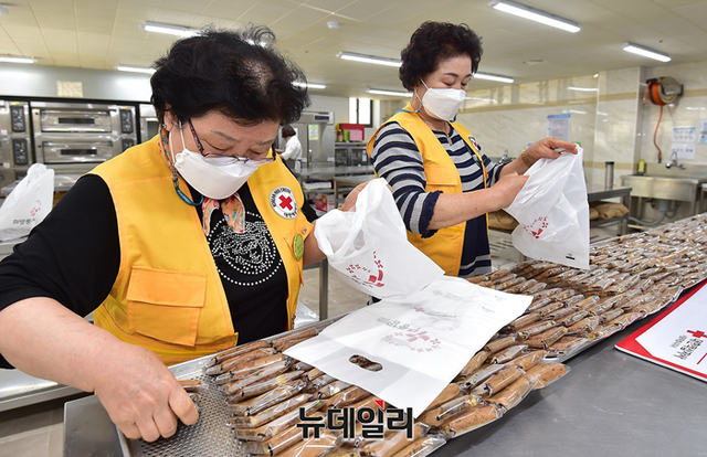 sb 다가가는 봉사단이 21일 오후 서울 노원구 대한적십자사 북부봉사관에서 취약계층과 결연세대에 전달할 빵을 만들고 있다. 이날 봉사단이 만든 빵은 약 1,000여 개로 성북구 취약계층과 중랑구 희망풍차 결연세대 약 40 세대에 전달될 예정이다.