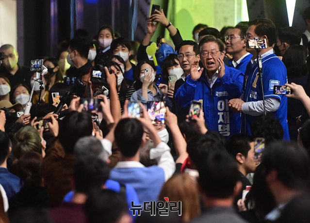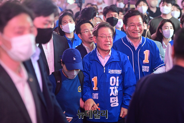 이재명 더불어민주당 총괄선대위원장과 송영길 서울시장 후보가 21일 밤 서울 강남역에서 열린 유세에서 이동하며 지지자들에게 인사를 하고 있다.