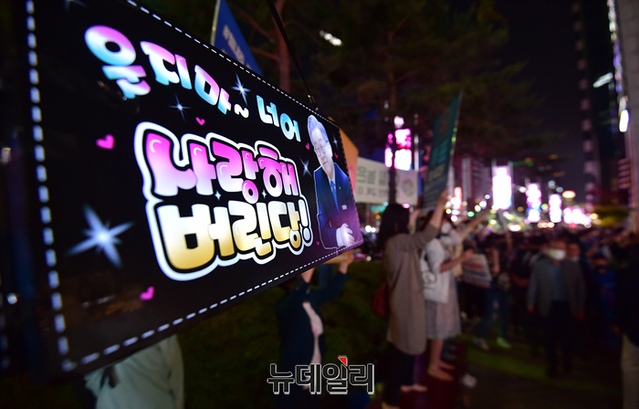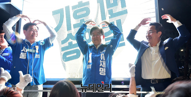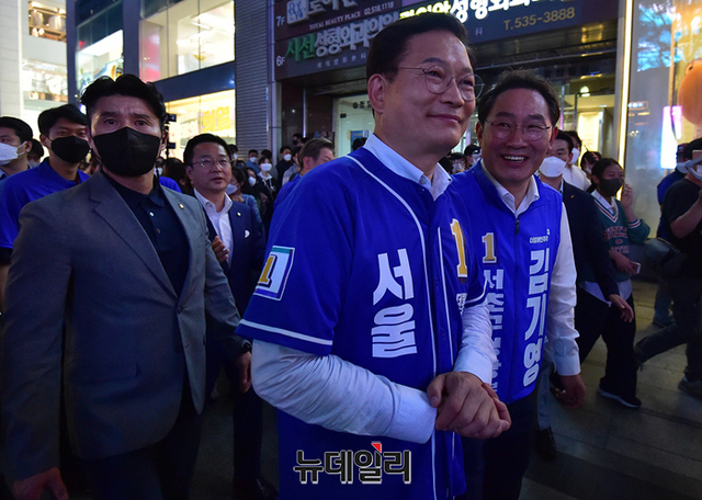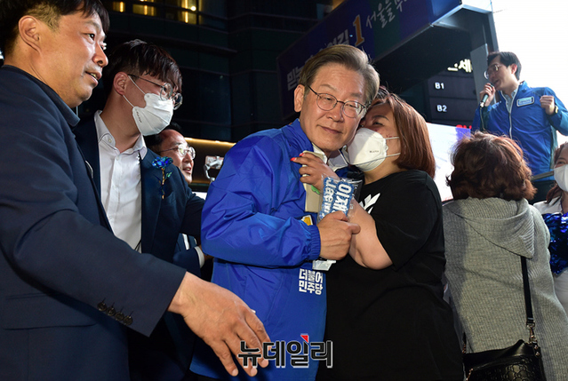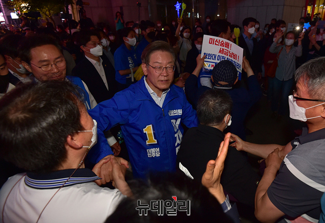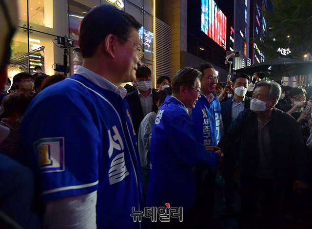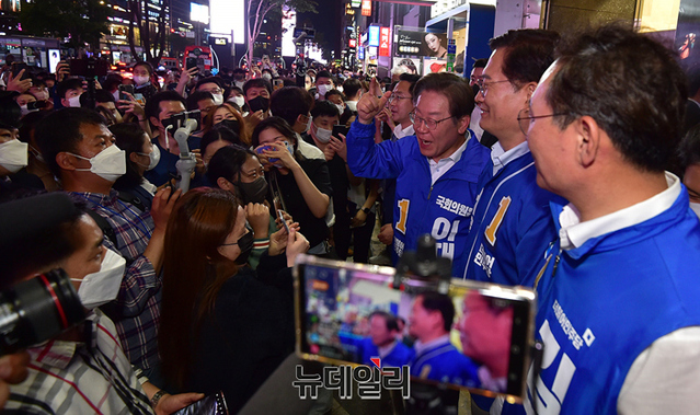 이재명 더불어민주당 총괄선대위원장이 21일 밤 서울 강남역에서 열린 송영길 서울시장 후보 유세에 김기영 서초구청장 후보와 입장하며 지지자들에게 인사하고 있다.