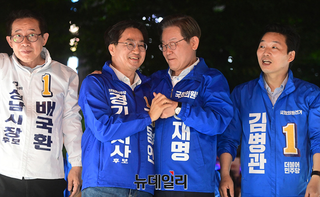 [포토] 야탑역에 모인 이재명-김동연-김병관-배국환