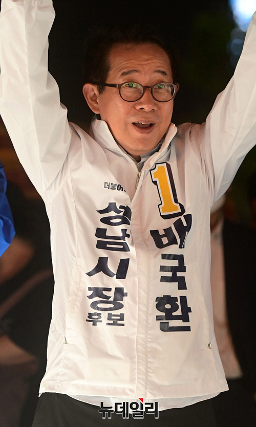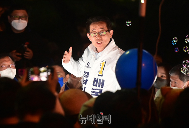 배국환 더불어민주당 성남시장 후보가 21일 밤 경기 성남시 야탑역 광장에서 열린 합동 유세에서 지지호소를 하고 있다.