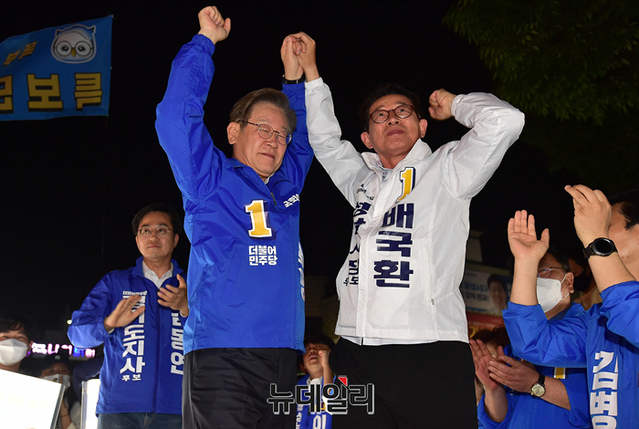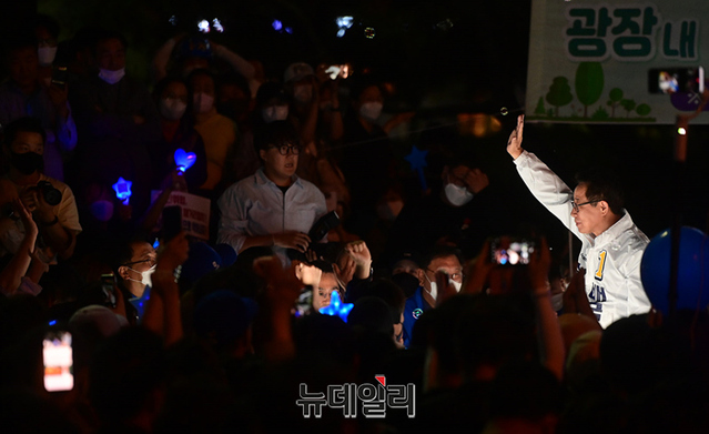 이날 유세엔 이재명 총괄선대위원장이 지원 유세에 나섰다. 앞서 이 위원장은 강남역을 찾아 송영길 서울시장 후보를 지원했다. (경기 성남=정상윤 기자)