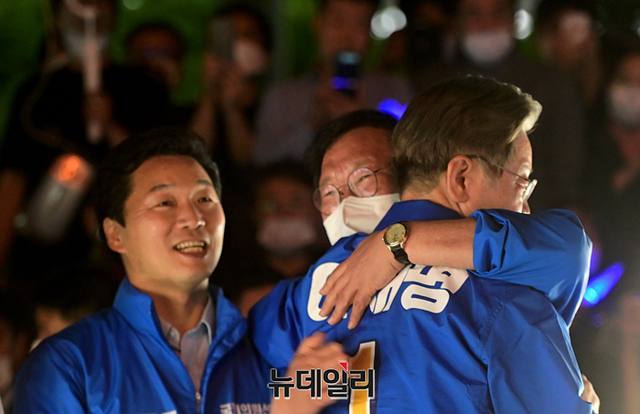 이날 유세엔 이재명 총괄선대위원장이 지원 유세에 나섰다. 앞서 이 위원장은 강남역을 찾아 송영길 서울시장 후보를 지원했다. (경기 성남=정상윤 기자)