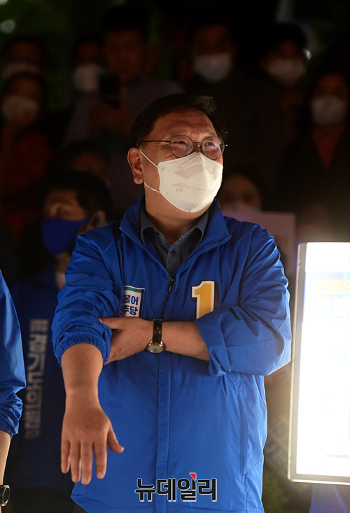 김태년 더불어민주당 의원이 21일 밤 경기 성남시 야탑역 광장에서 열린 합동유세에 참석해 자리하고 있다.