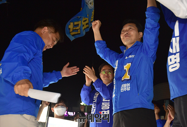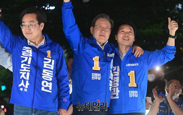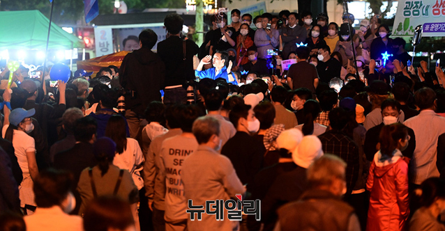 이날 유세엔 이재명 총괄선대위원장이 지원 유세에 나섰다. 앞서 이 위원장은 강남역을 찾아 송영길 서울시장 후보를 지원했다. (경기 성남=정상윤 기자)