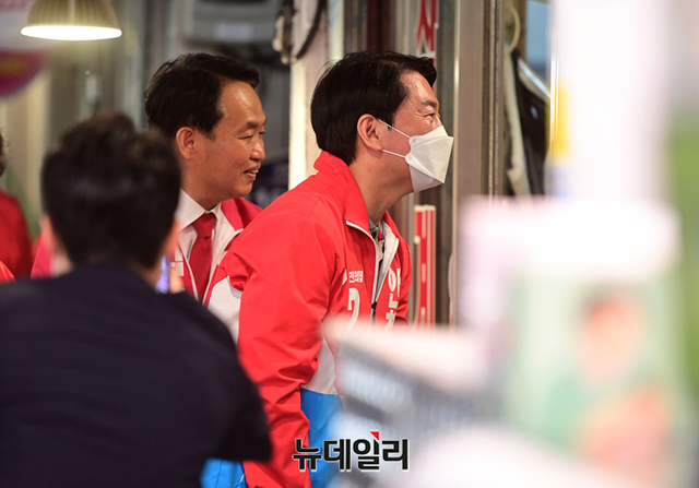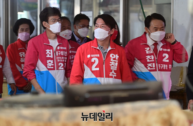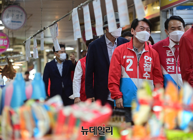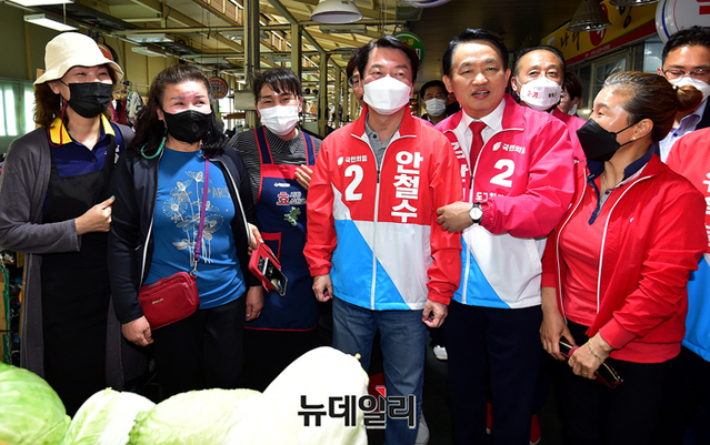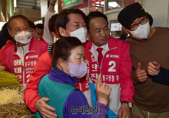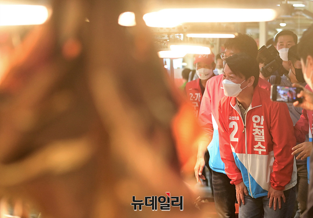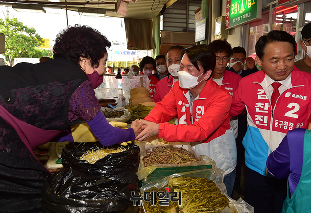 안철수 국민의힘 분당갑 국회의원 후보가 22일 오후 인천 동구 송림오거리에서 열린 김찬진 동구청장 후보 지원유세에 앞서 현대시장을 찾아 상인들과 인사를 나누고 있다. 이날 유세엔 안 후보와 유정복 인천시장 후보가 지원 유세에 나섰다. (인천=정상윤 기자)