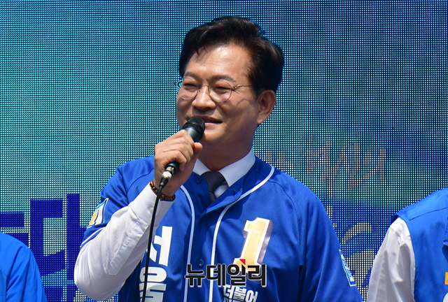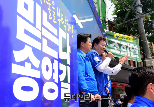 송영길 더불어민주당 서울시장 후보가 23일 서울 마포구 망원월드컵시장에서 열린 선거유세에서 지지를 호소하고 있다.