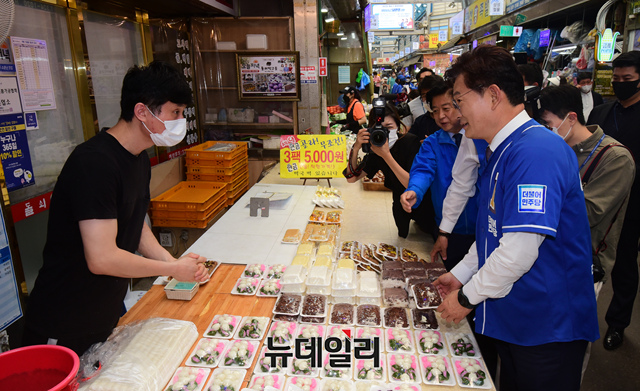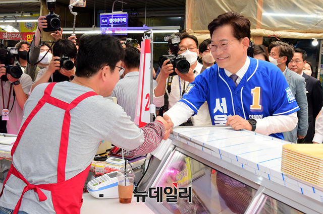송영길 더불어민주당 서울시장 후보가 23일 서울 마포구 망원월드컵시장에서 열린 선거유세에 앞서 시장상인들과 인사를 나누고 있다.