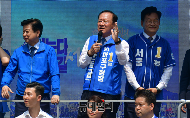 유동균 더불어민주당 마포구청장 후보가 23일 오전 서울 마포구 망원월드컵시장에서 시민들에게 지지를 호소하고 있다.