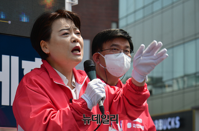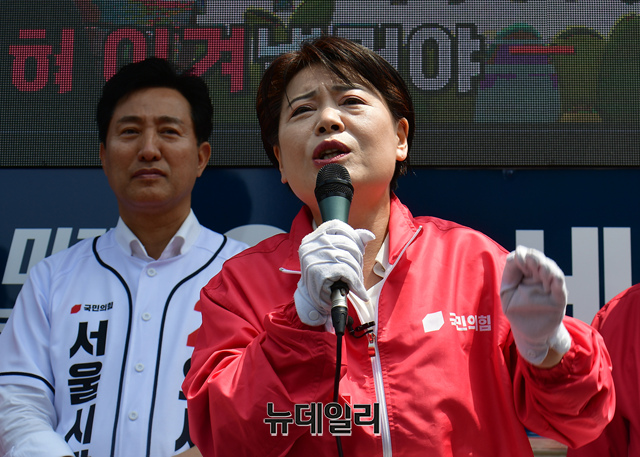 윤희숙 전 국민의힘 의원이 23일 서울 마포구 망원역 앞에서 열린 오세훈 국민의힘 서울시장 후보 유세에서 시민들에게 오 후보 지지를 호소하고 있다.