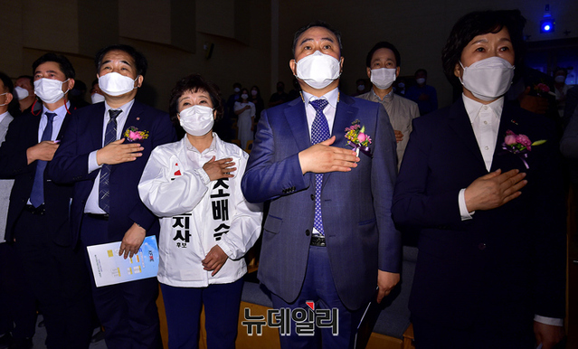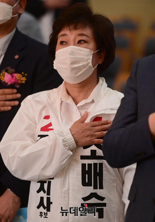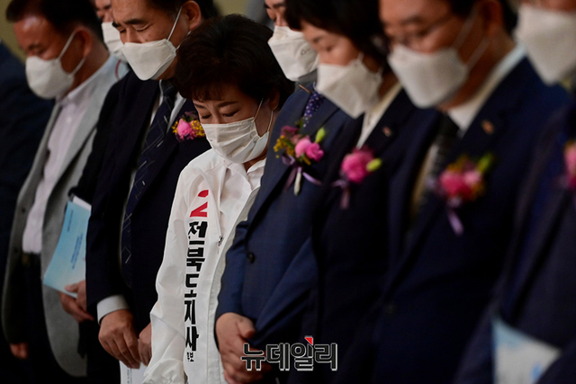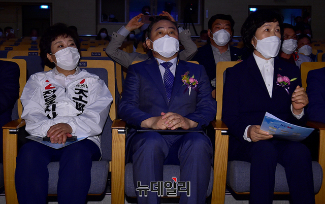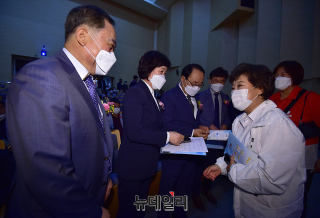 조배숙 국민의힘 전북지사 후보가 23일 오후 전북 전주시 한국전통문화전당에서 녈린 제4기 전안균 전북 소상공인연합회장 취임식에 참석해 오세희 소상공인연합회장과 인사를 나누고 있다. (전북 전주=정상윤 기자)