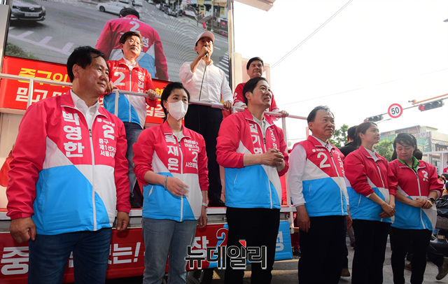 [포토] 중앙시장서 지지호소 하는 오세훈 서울시장 후보