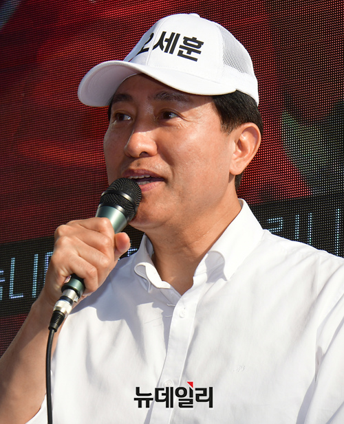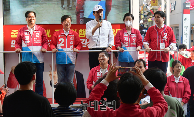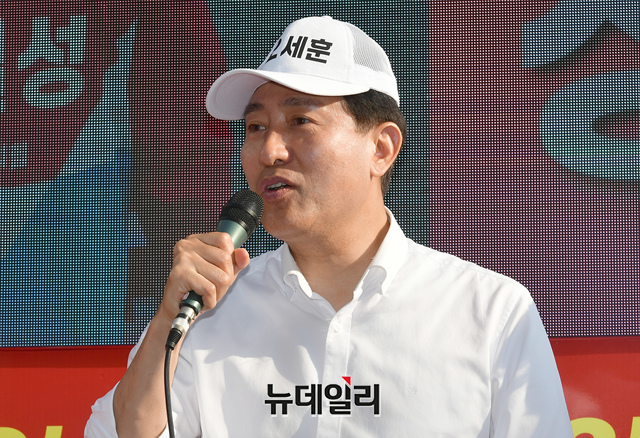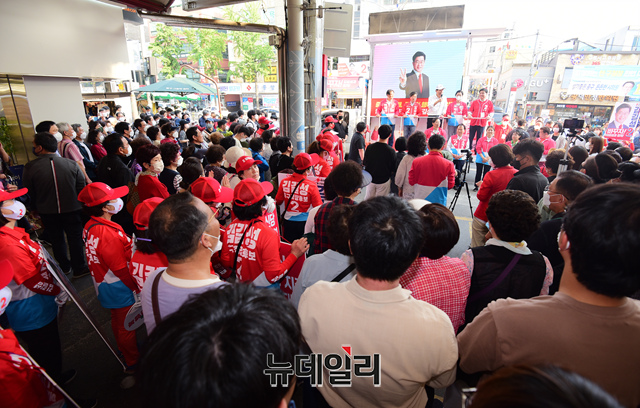 오세훈 국민의힘 서울시장 후보가 23일 오후 서울 중구 서울중앙시장에서 열린 선거유세에서 지지를 호소하고 있다.