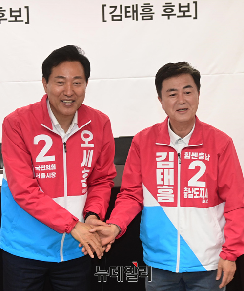 오세훈 국민의힘 서울시장 후보와 김태흠 충남도지사 후보가 24일 오전 서울 중구 한국프레스센터 '오썸! 캠프'에서 열린 '광역교통정책(충남-서울) 협약식'에서 악수를 하고 있다.