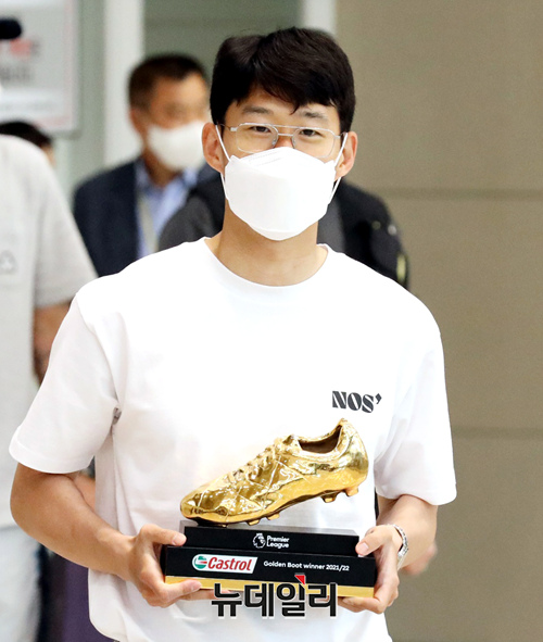 아시아 선수 최초로 EPL(잉글랜드 프리미어리그) 득점왕에 오른 토트넘 홋스퍼의 송흥민 선수가 24일 오후 인천국제공항을 통해 입국해 '골든 부트'를 들고 포토타임을 갖고 있다.