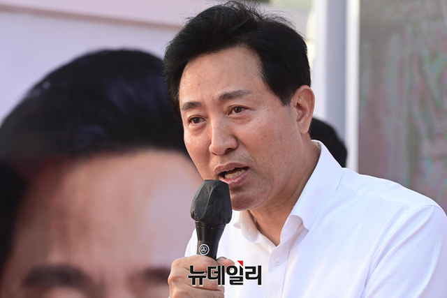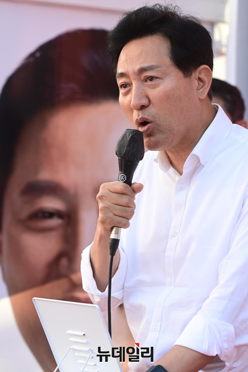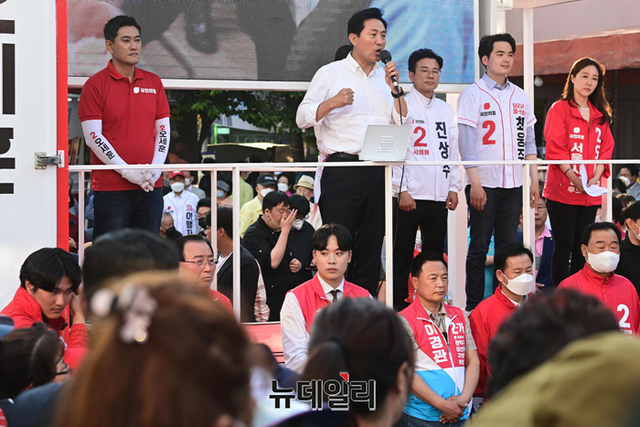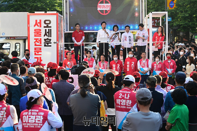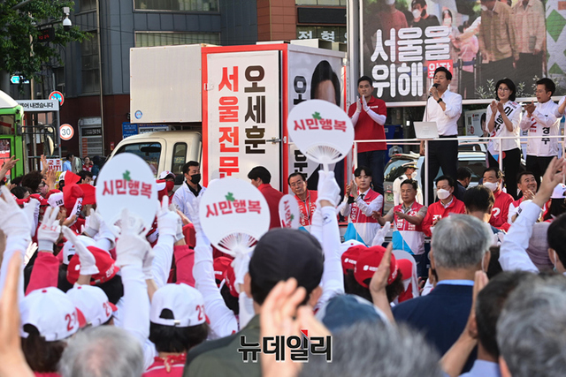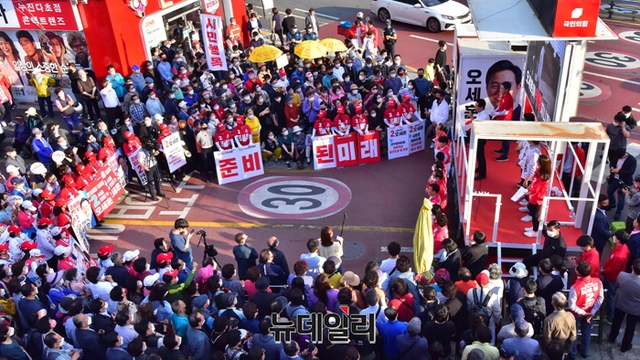 오세훈 국민의힘 서울시장 후보가 24일 오후 서울 관악구 난곡로 인근에서 열린 유세에서 지지호소를 하고 있다.