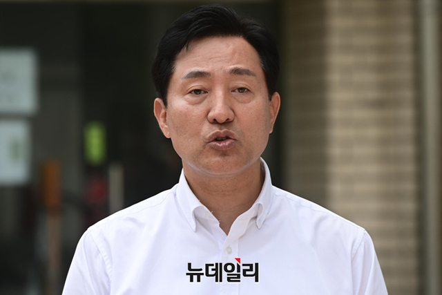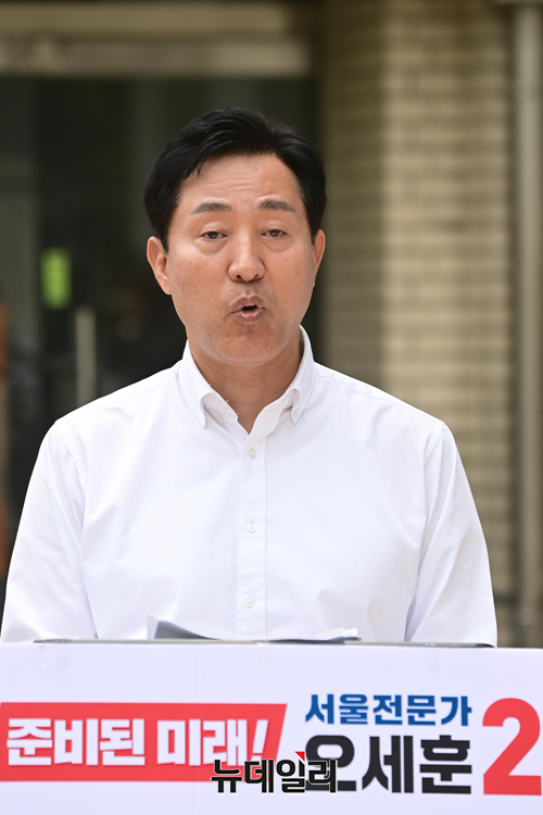 오세훈 국민의힘 서울시장 후보가 25일 오전 서울 영등포구 여의도지구대 앞에서 열린 유세에서 글로벌 선도도시 서울 공약을 발표하고 있다.