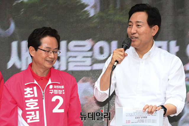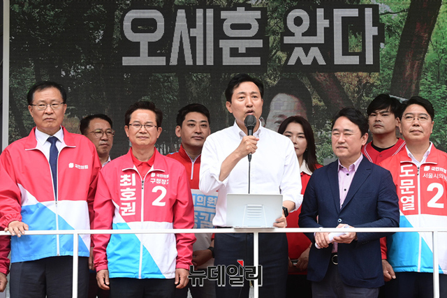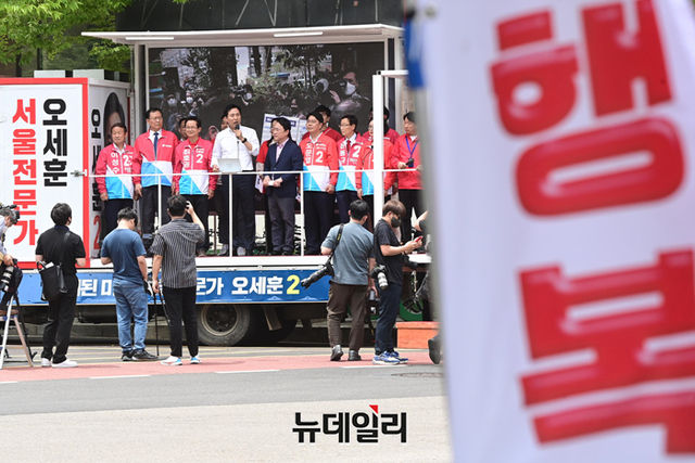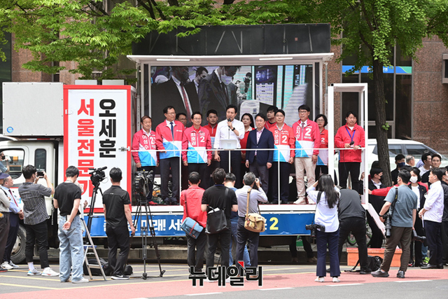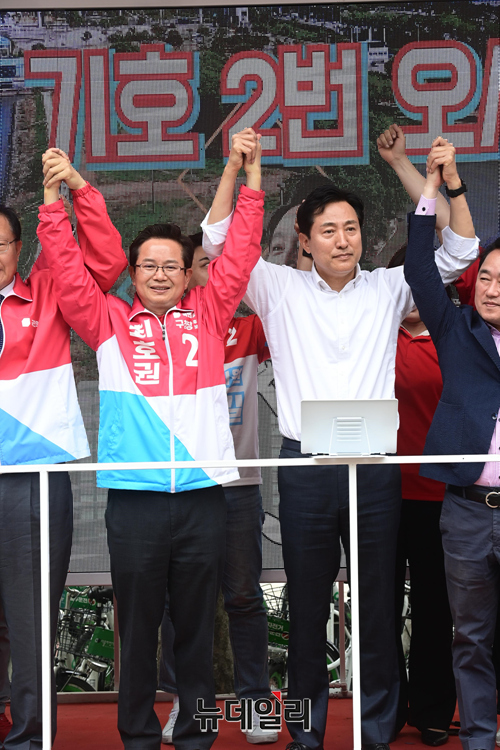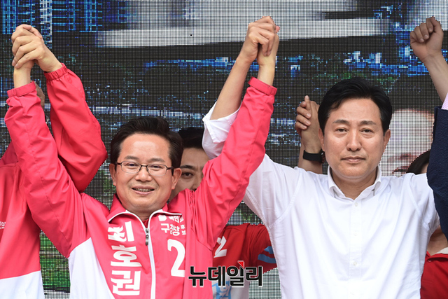 오세훈 국민의힘 서울시장 후보와 최호권 영등포구청장 후보가 25일 오전 서울 여의도 국제금융로에서 열린 유세에서 손 잡고 지지호소를 하고 있다.