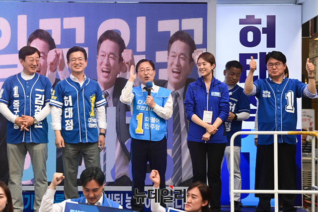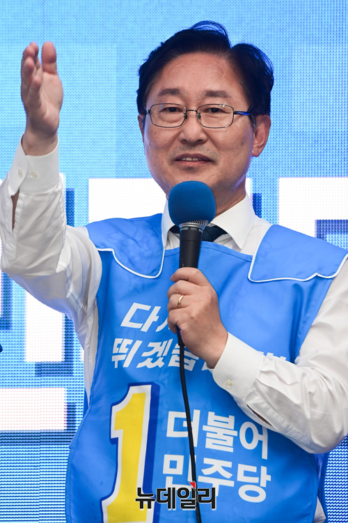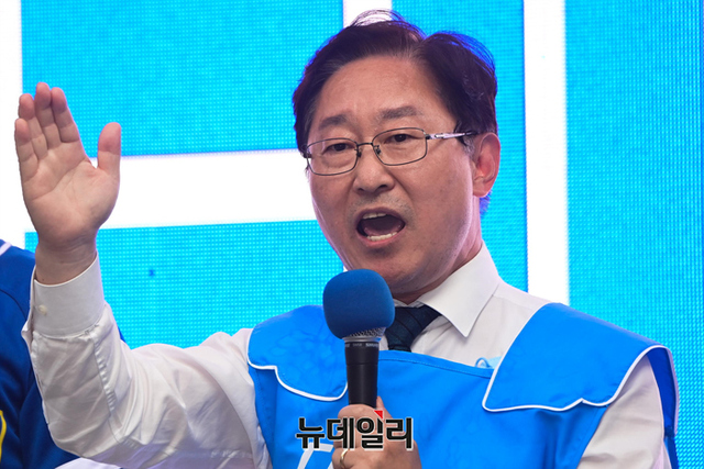 박범계 전 법무부 장관이 25일 오후 대전 중구 으능정이거리에서 열린 허태정 더불어민주당 대전시장 후보의 유세에서 지지호소를 하고 있다. (대전=강민석 기자)