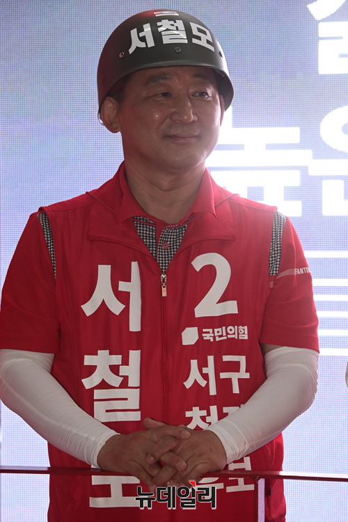 이준석 국민의힘 대표가 25일 오후 대전 서구 대전타운 일대에서 열린 이장우 대전시장 후보의 유세에서 서철모 대전서구청장 후보의 손을 들어 보이고 있다. (대전=강민석 기자)