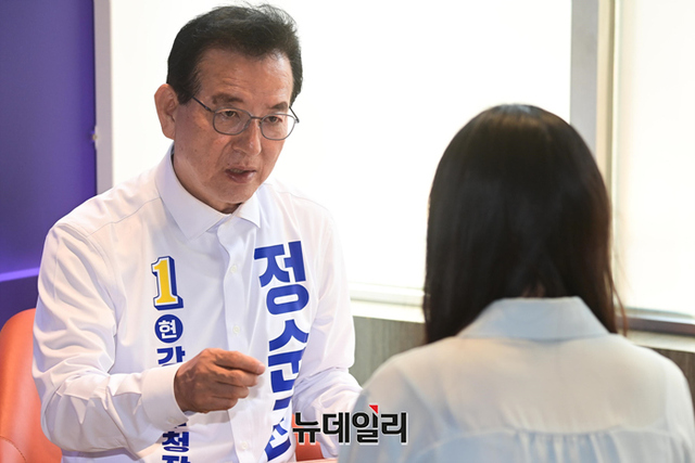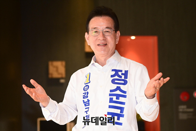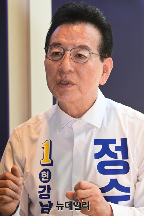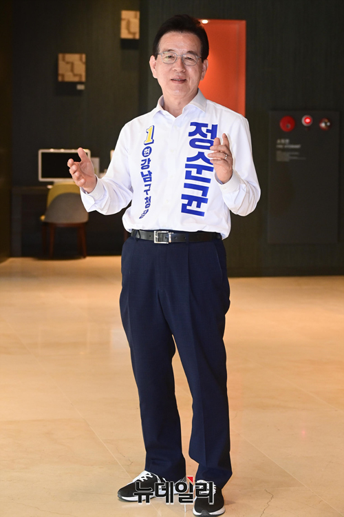 정순균 더불어민주당 강남구청장 후보가 23일 오후 서울 강남구 선거사무소 인근에서 뉴데일리와 인터뷰를 하고 있다.