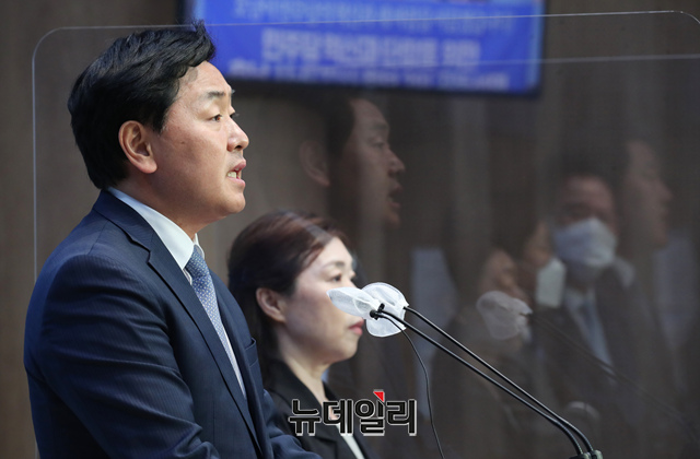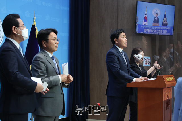 더불어민주당 강기정 광주광역시장 후보, 김영록 전남도지사 후보, 김관영 전라북도지사 후보가 26일 국회 소통관에서 합동 기자회견을 갖고 민주당의 단합을 위한 성명서를 발표하고 있다.