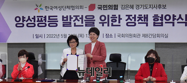 김은혜 국민의힘 경기도지사 후보가 26일 오후 국회 의원회관에서 허명 한국여성단체협의회장과 양성평등 발전을 위한 정책 협약식을 하고 있다.