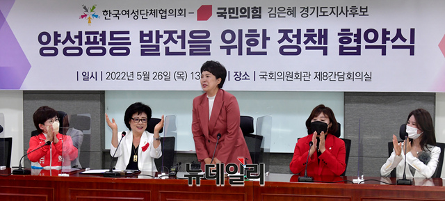 김은혜 국민의힘 경기도지사 후보가 26일 오후 국회 의원회관에서 열린 양성평등 발전을 위한 정책 협약식에서 인사말을 하고 있다.