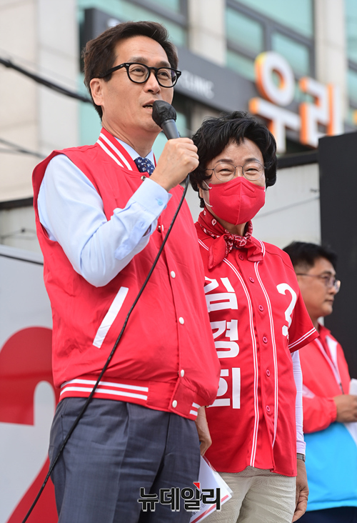 함진규 전 의원이 26일 오후 경기 이천시 중앙약국 앞에서 열린 김은혜 경기지사 후보 합동유세에 앞서 김경희 이천시장 후보를 소개하고 있다. (경기 이천=정상윤 기자)
