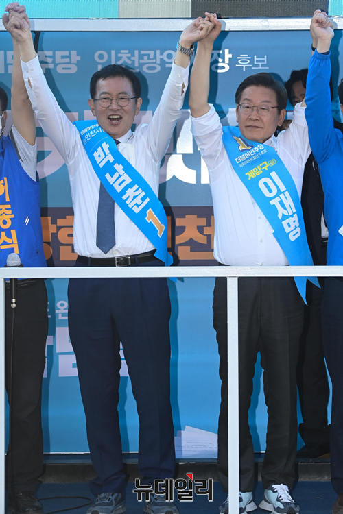 이재명 더불어민주당 인천 계양을 국회의원 후보와 박남춘 인천시장 후보가 26일 오후 인천 부평구 광장로에서 열린 유세에서 지지호소를 하고 있다. (인천=강민석 기자)